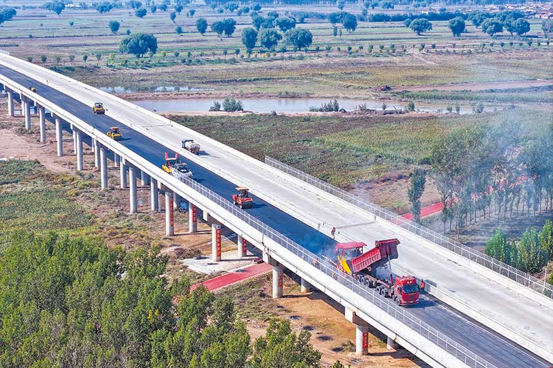 工人在241國道平遙段新建汾河大橋施工現場鋪設瀝青路面